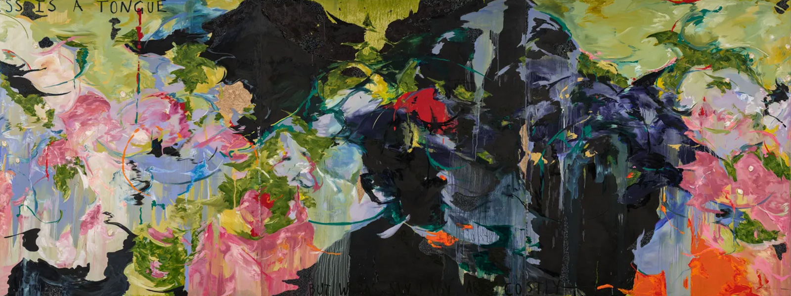 Image: Michaela Yearwood-Dan, In these bodies we live, 2025 Oil, acrylic, ceramic petals, glass beads, glitter, foil, paper and ink on canvas 250 x 1100 x 6 cm © Michaela Yearwood-Dan